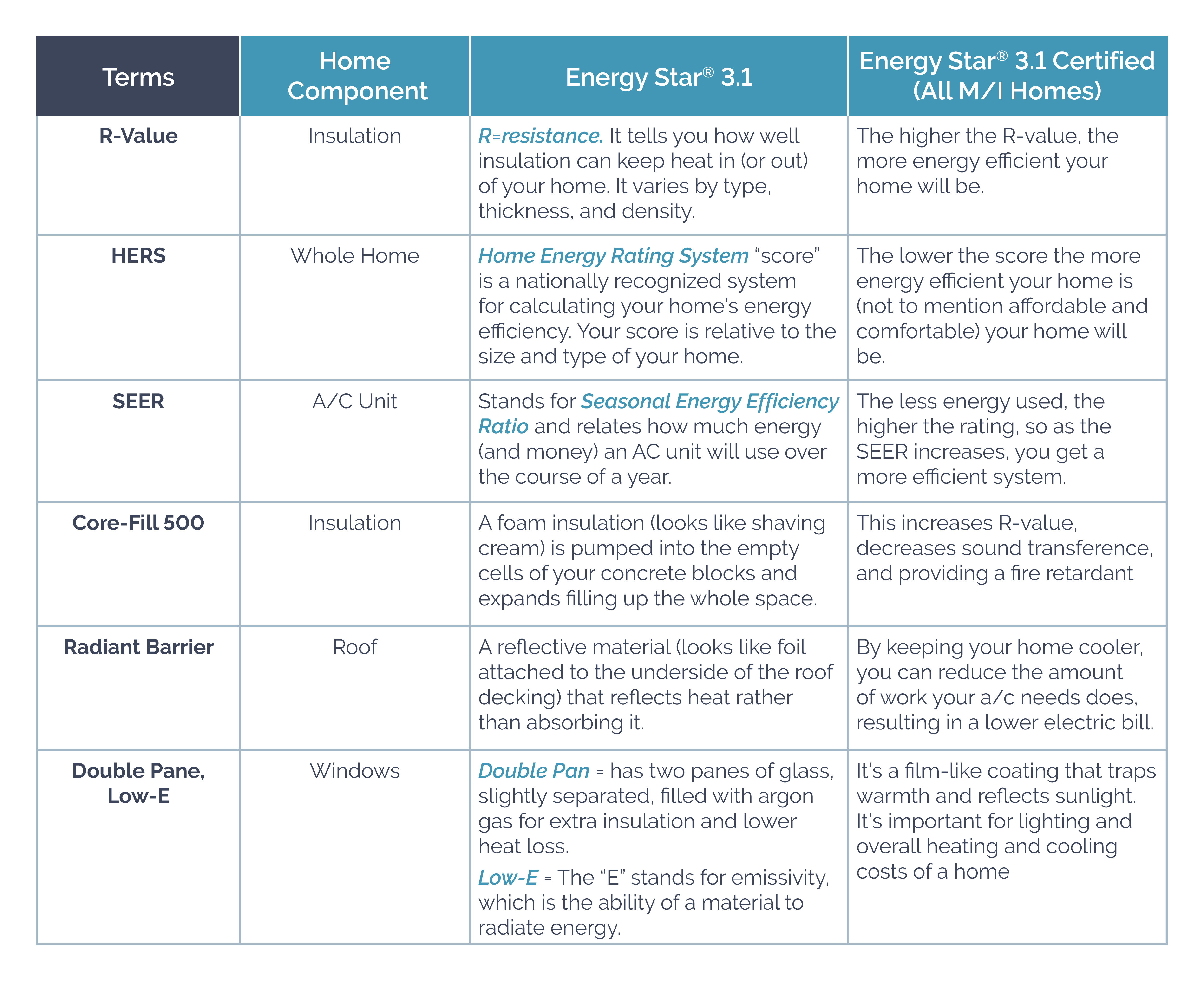 For a home that includes all the above energy efficient home construction methods and terms above, an ENERGY STAR® 3.1 Certified home is the way to go to ensure you have a more efficient, comfortable, and durable home that you will enjoy for years to come.