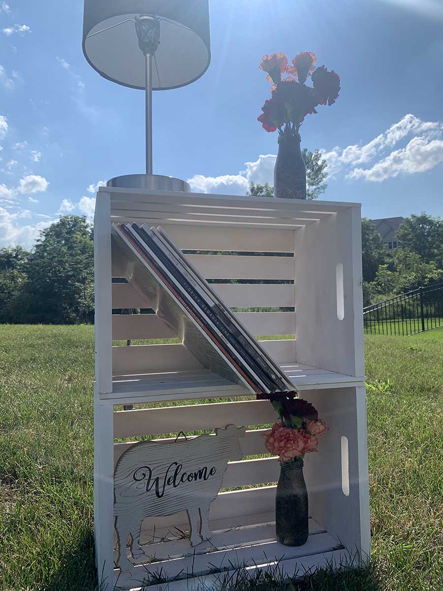 Once this is complete take five screws and place one screw in all four corners and the fifth one in the center. After that is complete stage your side table with whatever décor you would like. I put records, two follower vases, a welcome sign, and a lamp on mine!