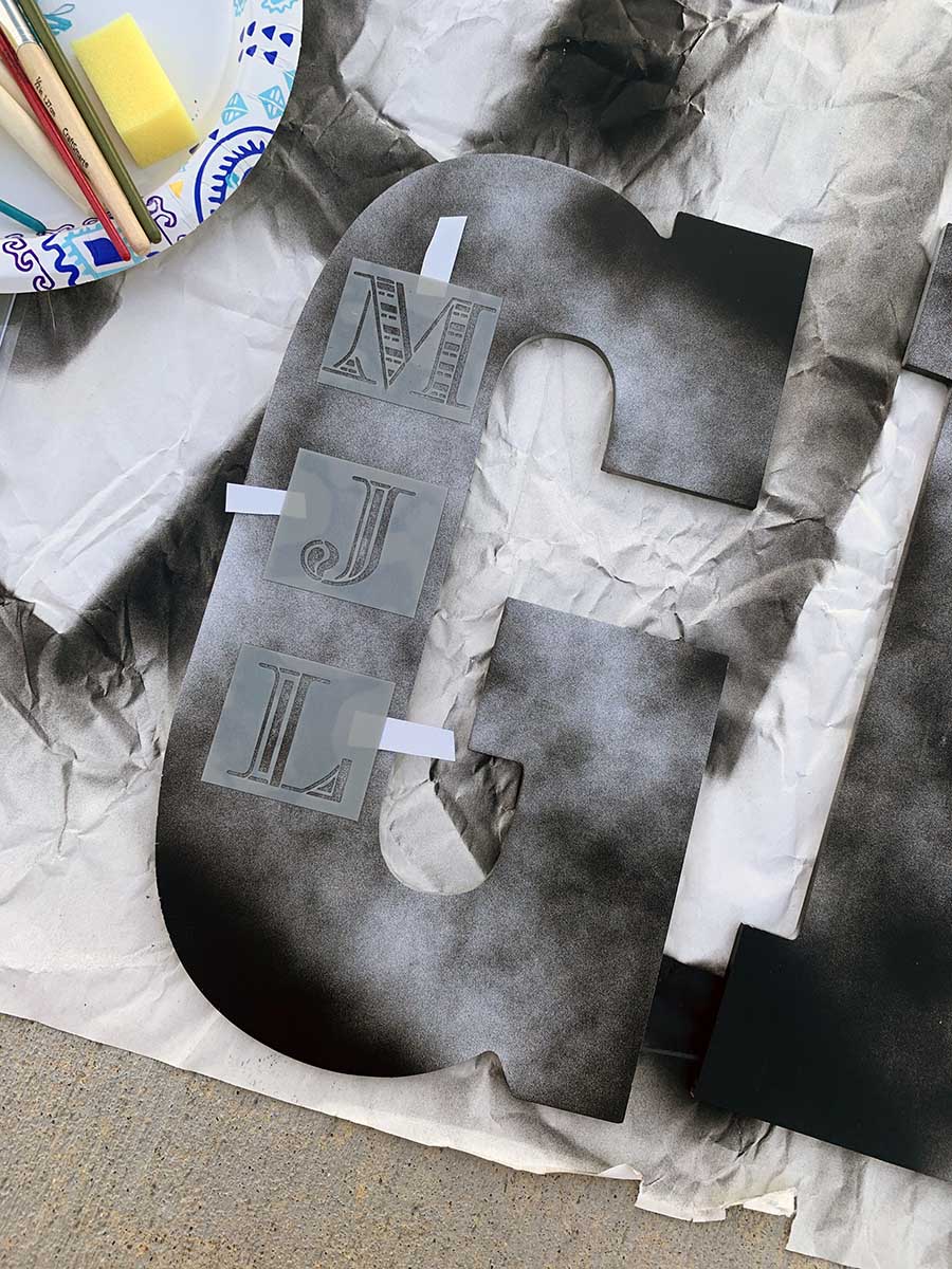 Take your letter and lay it out for spray painting on a sheet or tarp. I completed a splatter image; see below. Let the spray paint dry. Once the letters are dry take your stencils and place them on top of the larger letter. Take your outdoor paint and use the paint brush over the stencil. Remove the stencil and let paint dry. After everything is dry you can finish it off with a fabulous bow.