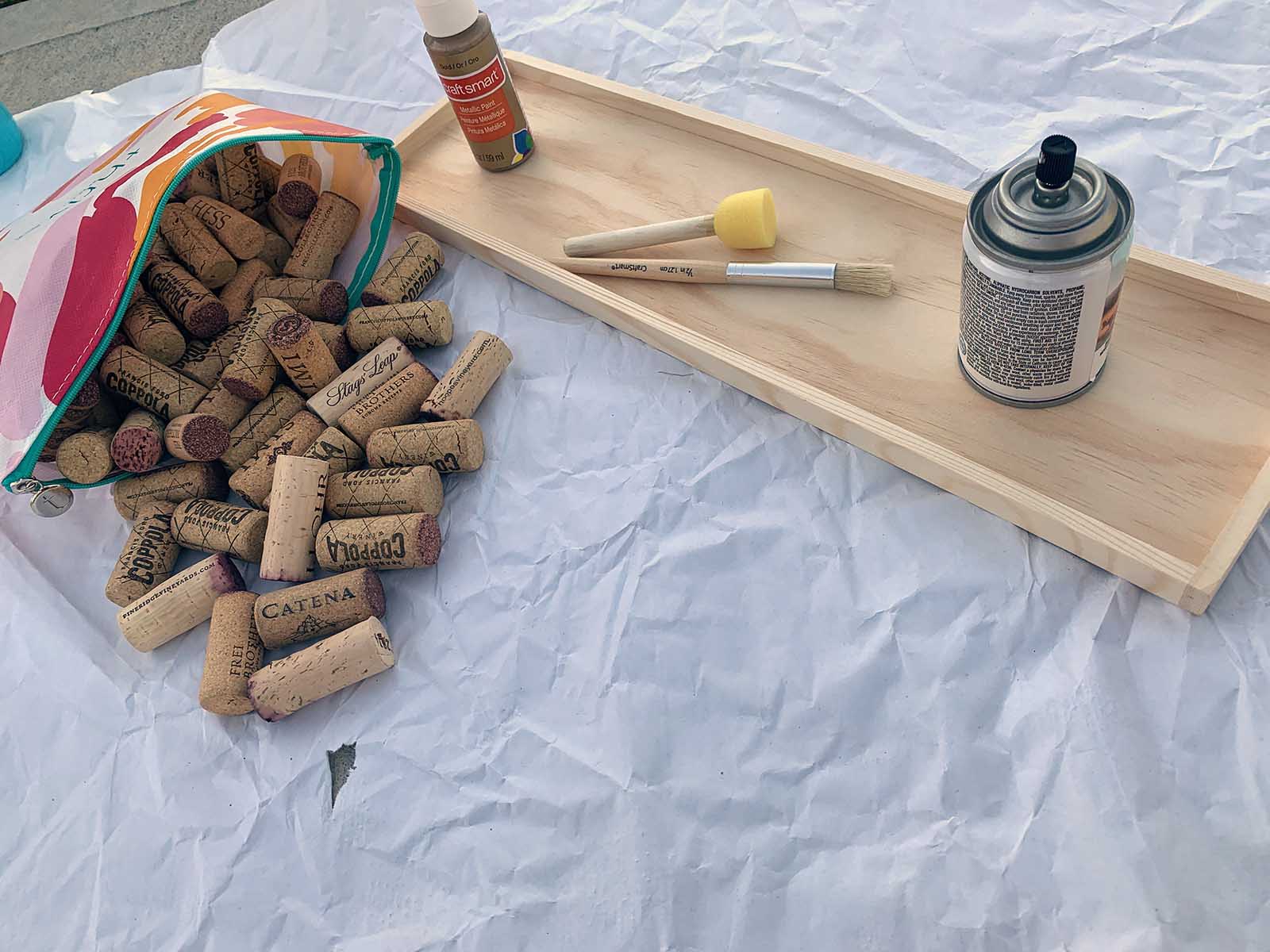 Once you have your corks in the formation you want them in it is time to paint. I set mine out on a piece of paper then proceed to spray paint them in gold!