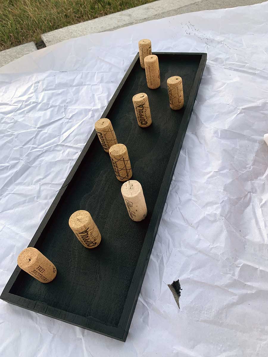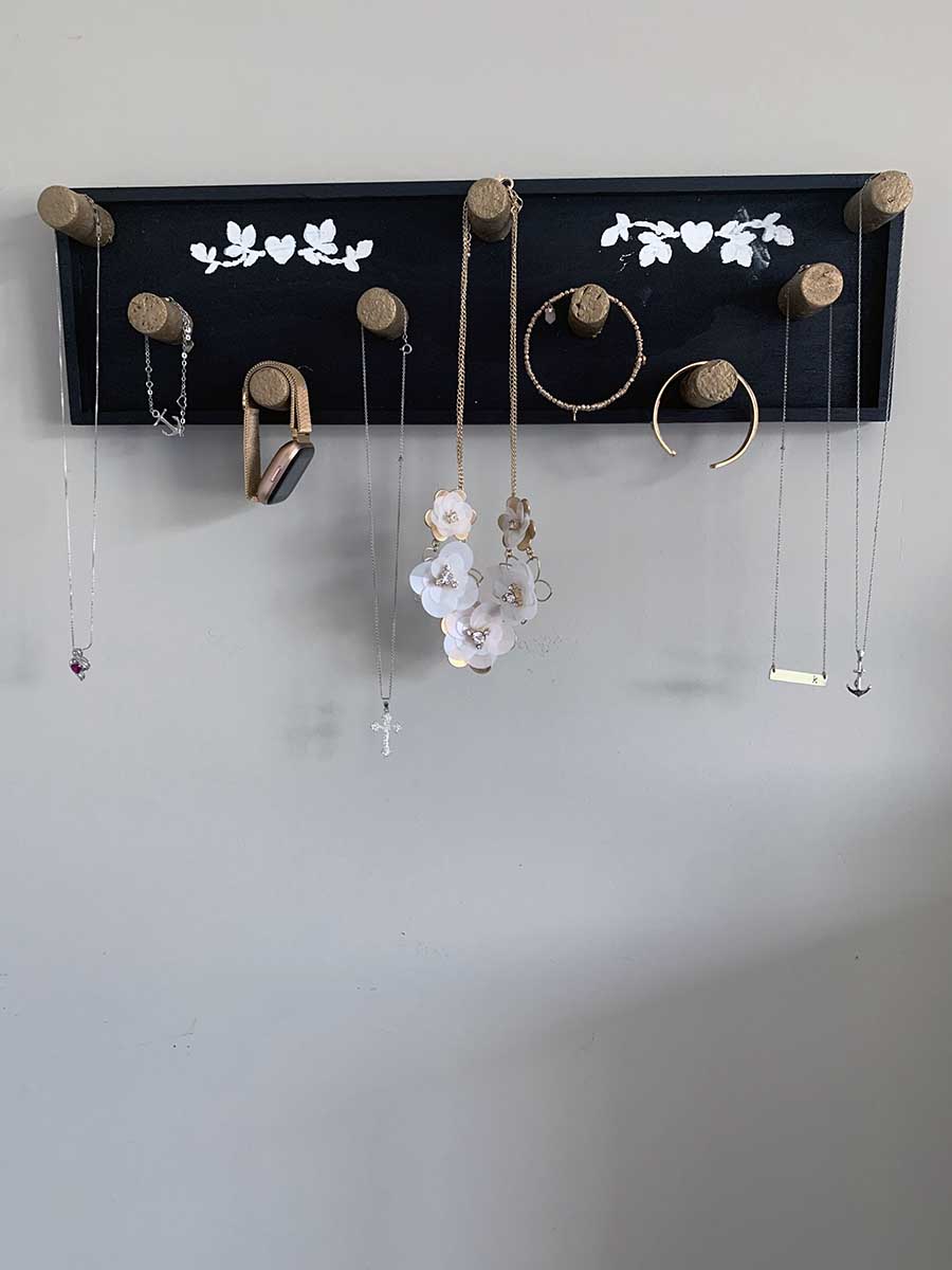 For our next DIY decorating blog project, this wine cork necklace holder is super easy and fun—not to mention perfect for organizing jewelry. Start off by taking your wood board and spray paint it in the color you desire. For my project I used black. Once the board dries, place your wine corks in the position you would like your jewelry to hang. I have done mine in a “W” formation. Make sure that all the corks are spaced out so you don’t have and overlapping. This helps keep your jewelry from getting tangled.