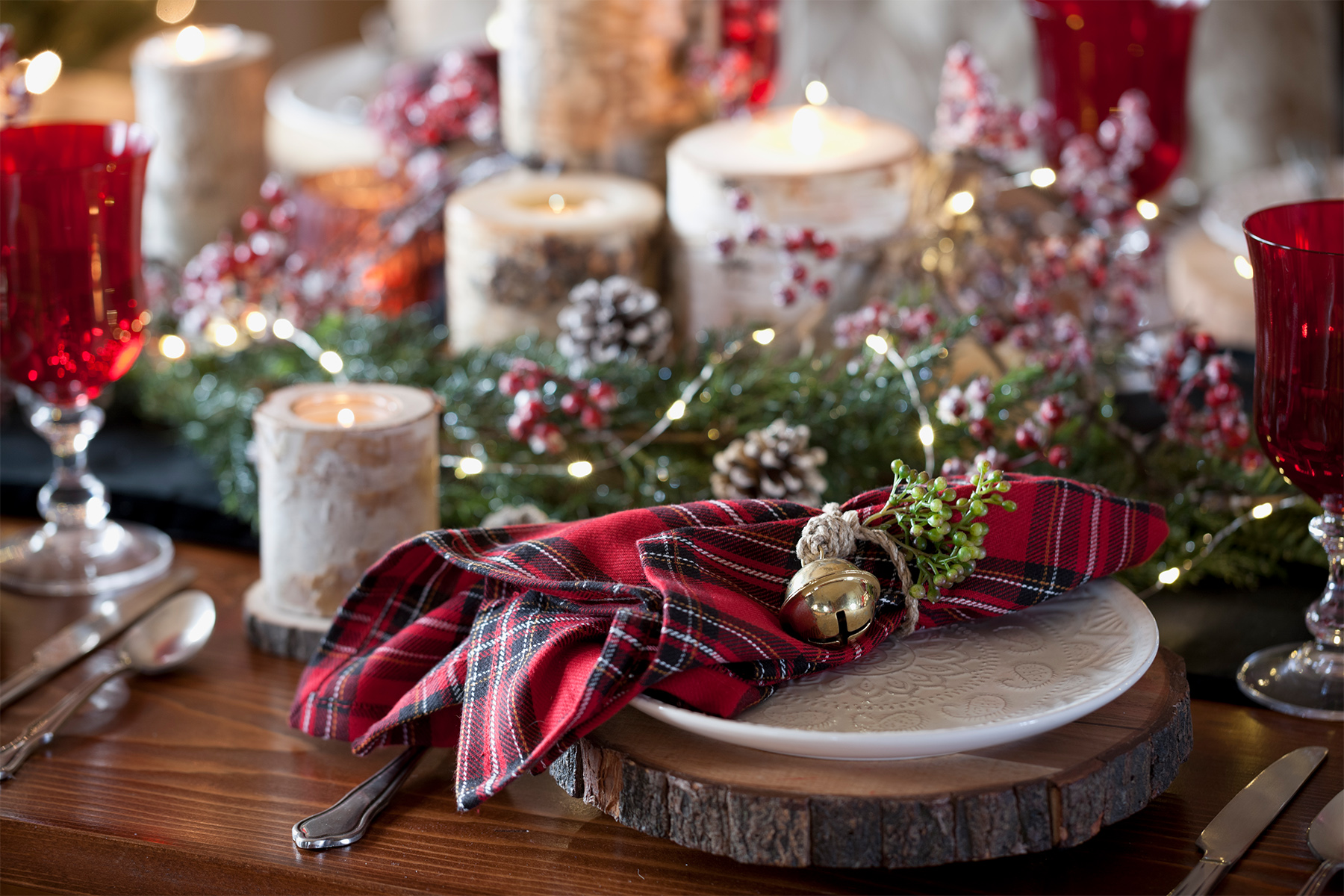 - Farmhouse Chic – The Farmhouse trend is still going strong and includes cozy plaid prints, rustic details like berries, natural woods and colors, or even aged metals. This look can vary to include a very neutral, natural palette, or be full of bright red berries!