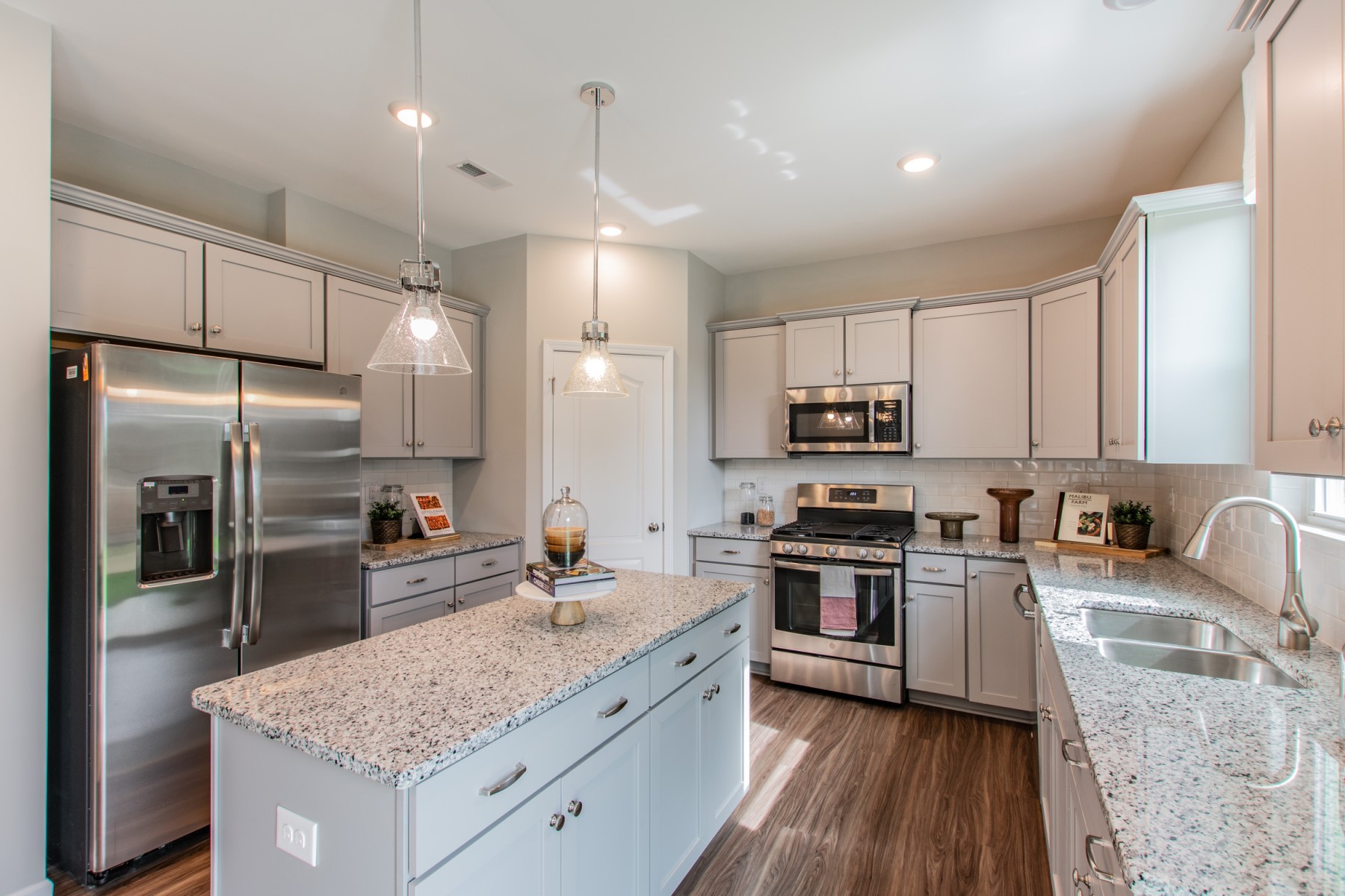 The kitchen is the heart of your home. In Heritage, you’ll enjoy a bright, open kitchen with granite countertops, subway backsplash tiles, and Shaker white and gray painted cabinets. Most of the kitchen layouts also provide an island—perfect for additional storage, display, and functionality.