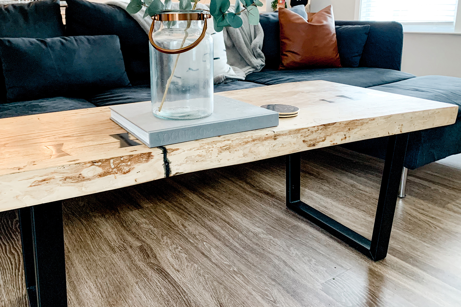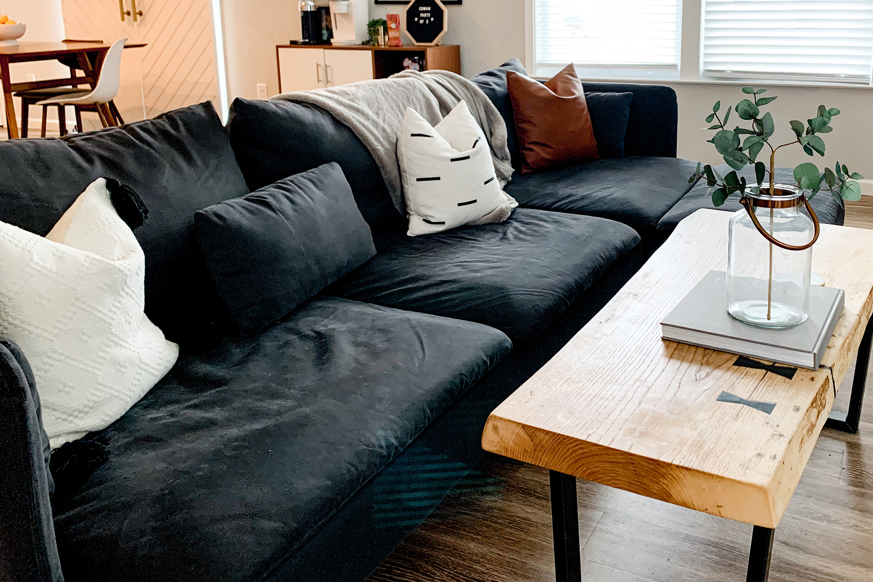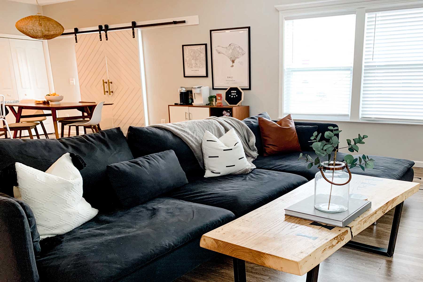 Zack wanted a coffee table that was natural and displayed craftsmanship. The live edge coffee tables are in style, and we both loved how you can use mid-century legs and pull in colors with epoxy inserts. We looked for a while and found many great options, but Zack was able to make a perfect fit. This was important to use that Zack could incorporate his love for woodworking into this space. Incorporating your passion for something like a hobby is a great way to display your personality.