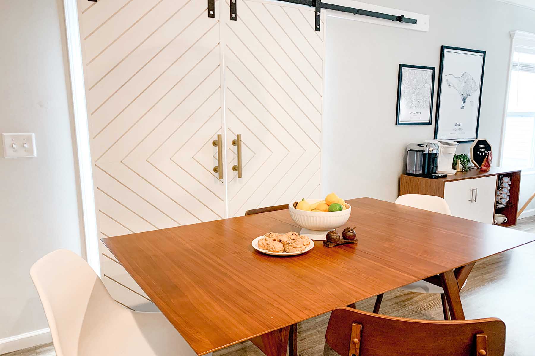 In my house, I chose to do the same wood tone from my coffee bar and bring that into my dining area for my dining table. This can be something as big as a piece of furniture like I did, or as small as bringing a color into the new room from the previous.