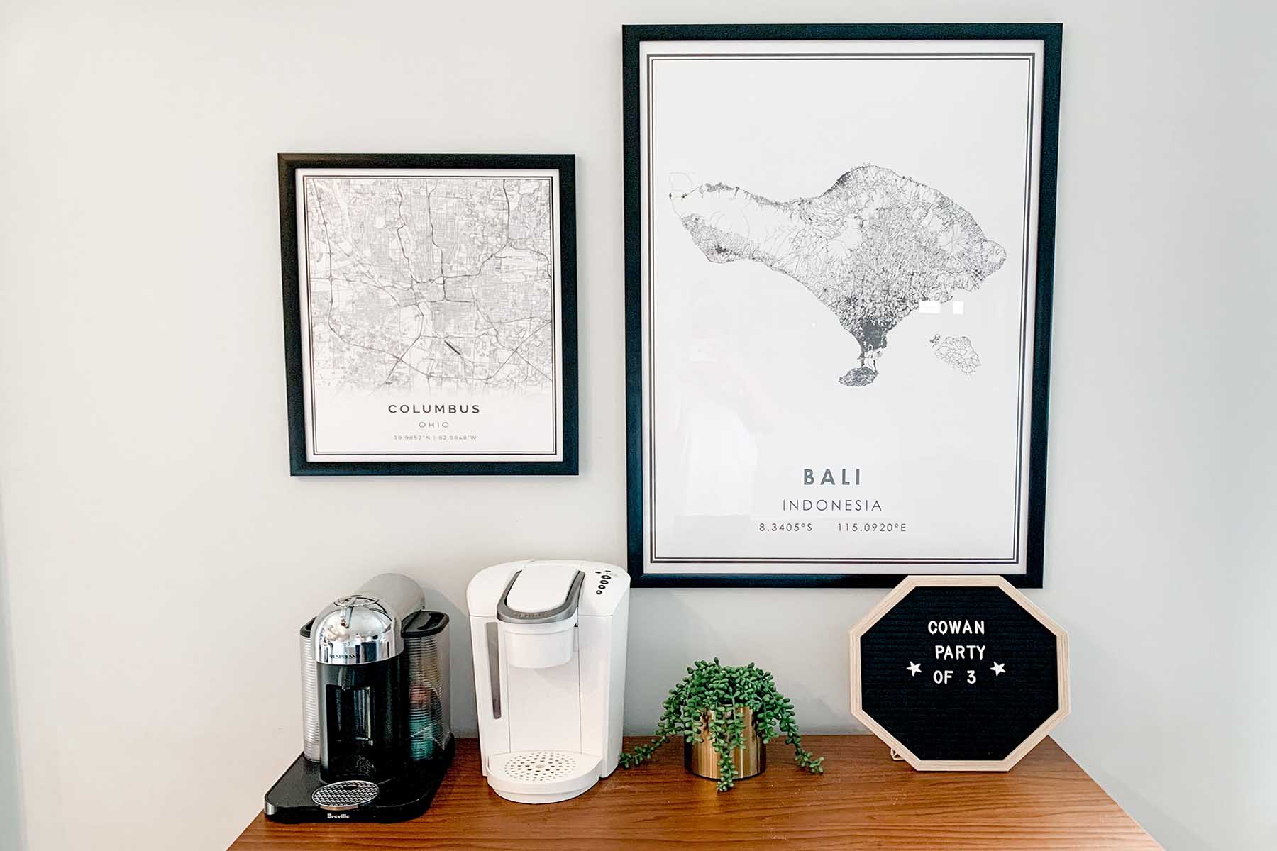 We decided to have custom maps made for our walls that speak to our story as a couple. We both are from Ohio, but our love grew in Columbus. This is our home, and we got married here. We also honeymooned in Bali, so that is a special place for us. Every time we see these pictures, it reminds us of the love that got us here.