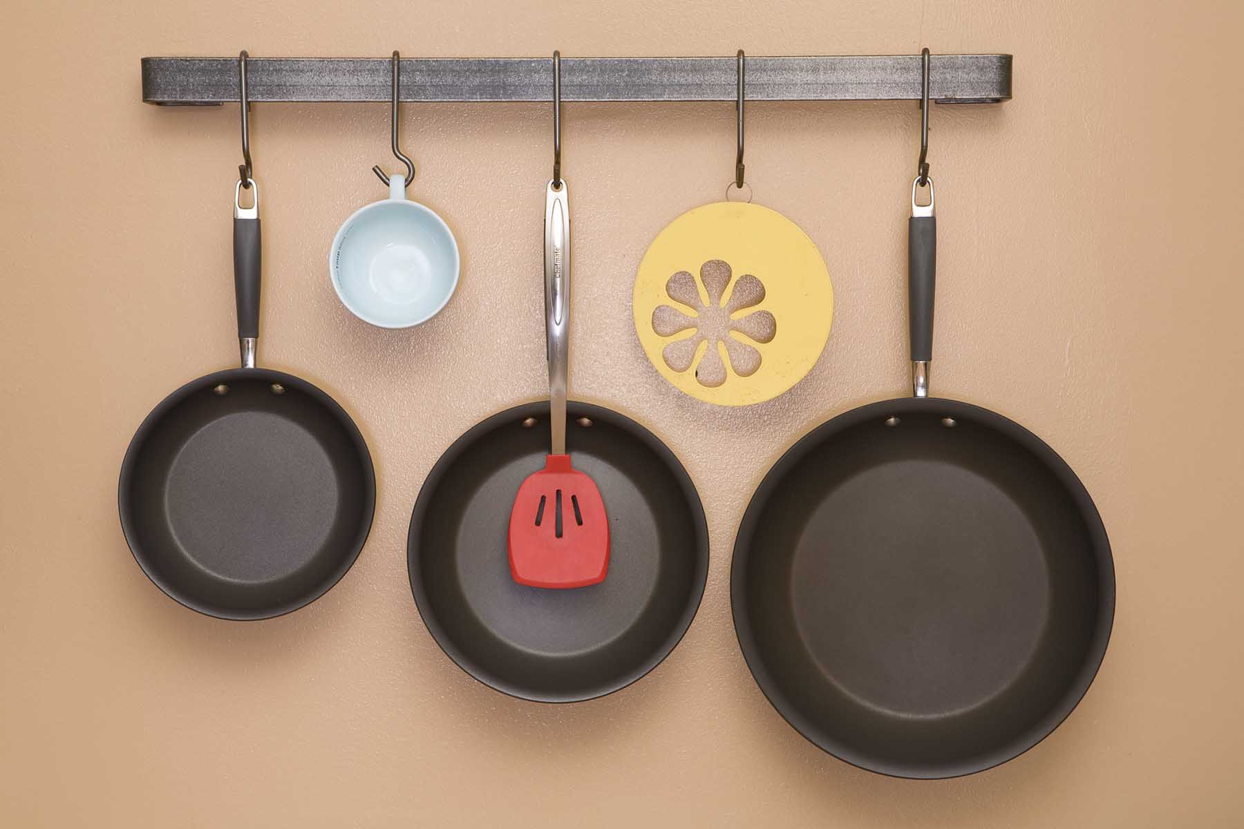 For pots and pans, you can set up racks on a kitchen wall or inside your pantry where you can hang the utensils by their handles. This gets them out of the way, adds a little more room in your kitchen drawers, and actually adds a decorative touch to your space.